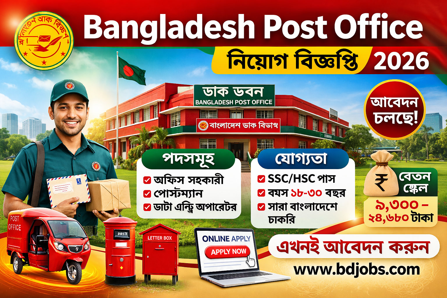 বাংলাদেশ পোস্ট অফিস সাধারণত অফিস সহকারী পোস্টিং মেন, মেইল গার্ড, ডাটা এন্ট্রি অপারেটর সহ বিভিন্ন পদে নিয়োগ দেওয়া হয়, এইসব পদে আবেদন করার জন্য নির্দিষ্ট শিক্ষাগত যোগ্যতা, বয়স এবং কিছু প্রয়োজনীয় কাগজপত্র লাগে, নিচে চাকরির বিস্তারিত তথ্য ধাপে ধাপে তুলে ধরা হলো একটু ভালো করে পড়ে নিবেন।
